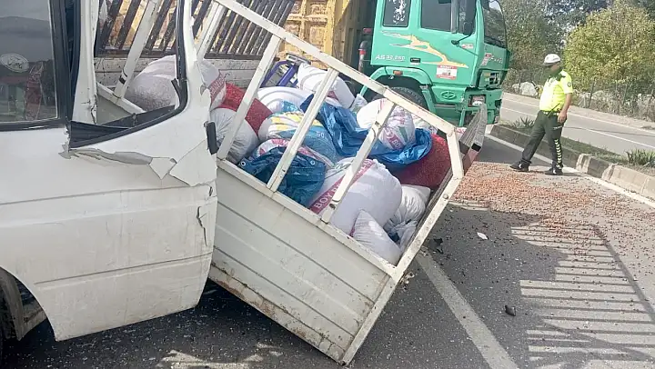 Bartın’da Vural ak kavşağından Amasya istikametine gidiş yolunda hafriyat kamyonu ile fındık yüklü kamyonet çarpıştı. Çarpışmanın etkisiyle kamyonetin kasası koparak fındık çuvalları yola savruldu.