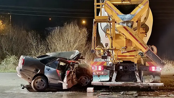 Bartın İnkum yolunda meydana gelen trafik kazasında, bir otomobil çimento fabrikasını geçtikten sonra çift yolun bitiminde dönüş yapmak isteyen beton mikserine yandan çarptı.