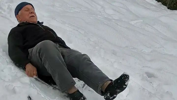 Yaşlı amcalar ve çocuklar, evlerinden getirdikleri naylon poşet ve tepsilerle yaklaşık 20 metrelik yamaçtan aşağı kaydı.