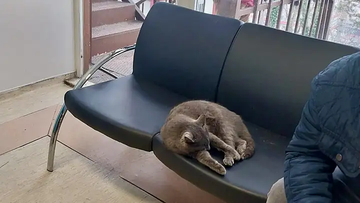 Mışıl mışıl uyuyan, ara sıra uyanıp kısık gözlerle yanındakilere bakan, sonra gerinip tekrar uykuya dalan kül kedisinin görüntüsü hastalar tarafından da ilgiyle ve sevgiyle izlendi.