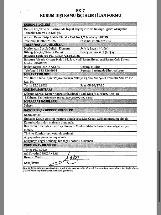 İlanlara başvurmak isteyen adayların, Bartın Merkez’de bulunan Bartın Gıda İnşaat Peyzaj Turizm Nakliye Eğitim Akaryakıt Temizlik San. ve Tic. Ltd. Şti. adresine, ilanda belirtilen tarihler arasında şahsen başvuruda bulunmaları gerekiyor.