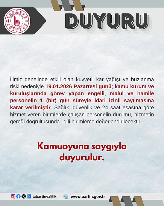 Öte yandan, olumsuz hava koşullarının ulaşımda risk oluşturması nedeniyle trafik tedbirleride devreye alındı. Yapılan meteorolojik değerlendirmeler doğrultusunda, 19 Ocak 2026 Pazartesi günü saat 08.00’den, 20 Ocak 2026 Salı günü saat 08.00’e kadar; motosiklet, scooter, elektrikli scooter, elektrikli bisiklet, bisiklet ve motokuryelerin trafiğe çıkması tedbiren yasaklandı.
