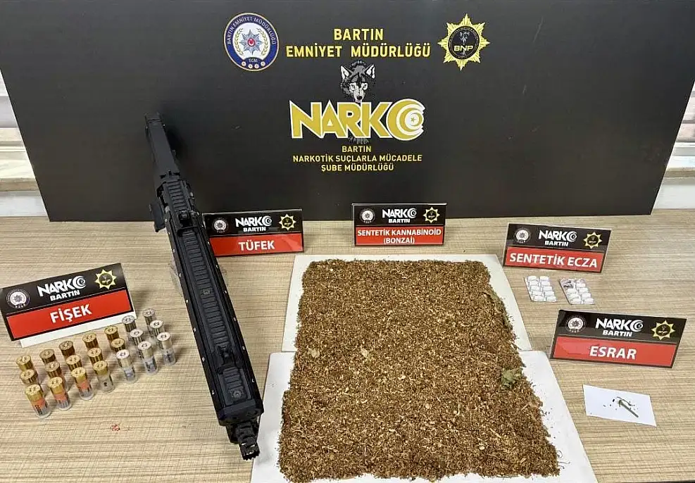 Bartın Emniyet Müdürlüğü Narkotik Suçlarla Mücadele Şube Müdürlüğü ekiplerince savcılık koordinesinde yapılan operasyonda 6 şahıs yakalanarak gözaltına alınmış, şahısların ikametlerinde yapılan aramalarda ise 449,55 gram sentetik kannabinoid (bonzai) maddesi, 2,89 gram esrar, 17 adet sentetik ecza, 1 adet pompalı tüfek ele geçirilmişti.