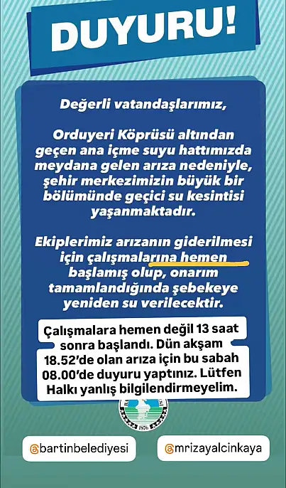 Gelen tepkilerin ardından Bartın Belediyesi, kamuoyunun eleştirilerine yanıt olarak saat 17.00’de bir “Kamuoyuna Duyuru” metni paylaştı. Bu kez arızanın dün akşam saat 20:00’de meydana geldiği ileri sürüldü ve sabaha karşı ikinci bir patlak oluştuğu iddia edildi. Halbuki arıza için 18.54’te paylaşım yapmıştık.