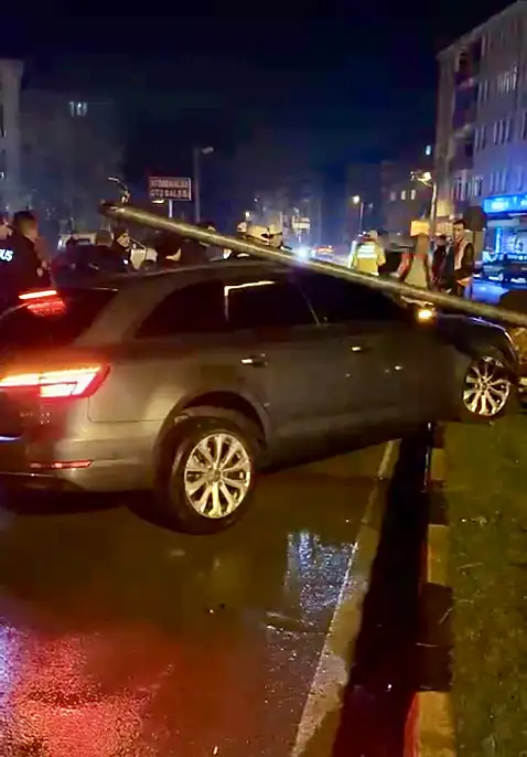 Bartın Gölbucağı kavşağında seyir halindeki bir otomobil, trafik ışıklarının bulunduğu direğe çarparak durabildi. Çarpmanın etkisiyle direk büyük bir gürültüyle aracın üzerine devrildi.