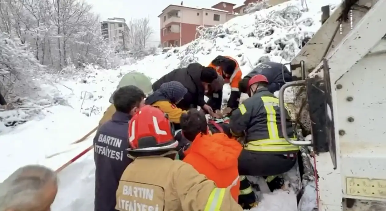 Yol kenarındaki toprak zemine doğru savrulan kamyonun arkasında bulunan işçi, araç ile zemin arasında sıkıştı. O anlar çevrede büyük panik yaşanmasına neden oldu.