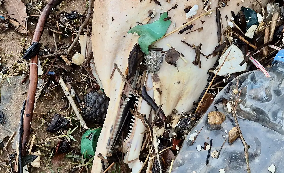 Dev dalgalar, ölü yunus balığının kalıntılarını sahile sürükledi