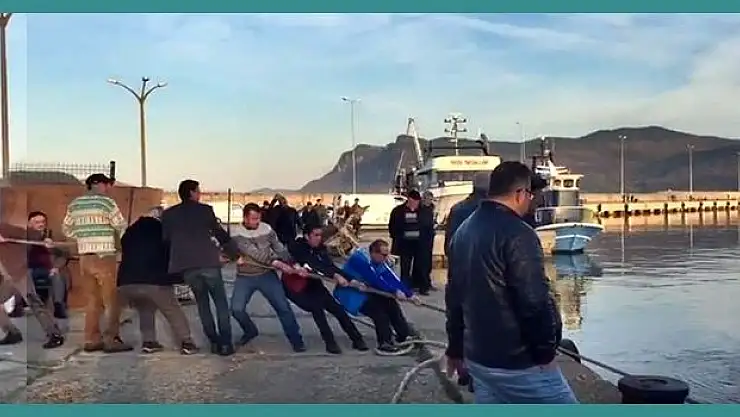 Vatandaşların tekneyi çıkarmak için halatı çekerken verdikleri mücadele kameralara yansıdı.