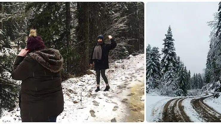 Kar yağdığını duyan bazı vatandaşlar Ahmetusta geçidinden yaylaya çıkan yolda ilk kar yağışına tanıklık ederek kar topu oynadılar.