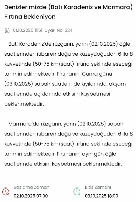 Meteoroloji’den yapılan son değerlendirmelere göre, yarın (2 Ekim 2025) öğle saatlerinden itibaren Batı Karadeniz’de kuvvetli rüzgar fırtına şeklinde esecek. Doğu ve kuzeydoğudan esecek rüzgarın saatte 50-75 kilometre hıza ulaşması bekleniyor. Fırtınanın 3 Ekim Cuma günü sabah saatlerinde kıyılarda, akşam saatlerinde açık denizlerde etkisini kaybetmesi öngörülüyor. Yetkililer, vatandaşları ve balıkçıları dikkatli olmaları konusunda uyardı.