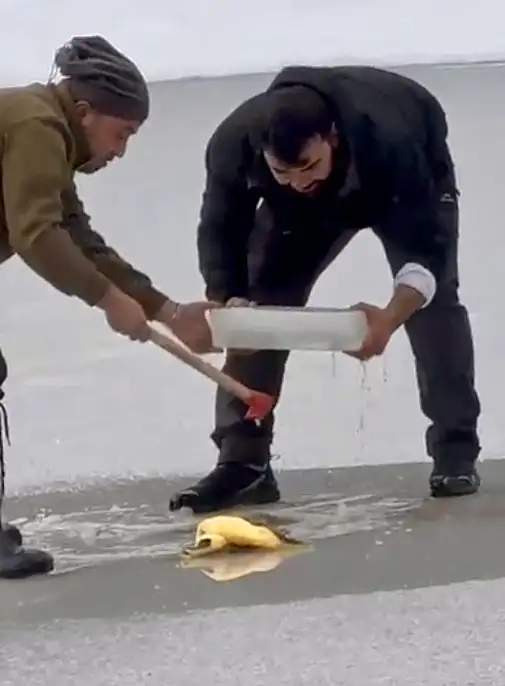 Hafta sonunu değerlendirmek için aileleriyle birlikte bölgeye gelen doğaseverlerden biri, göletin üzerinde yürüdüğü sırada yanında getirdiği motorlu testereyle buz tabakasını kesti.