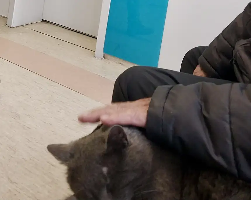 Mışıl mışıl uyuyan, ara sıra uyanıp kısık gözlerle yanındakilere bakan, sonra gerinip tekrar uykuya dalan kül kedisinin görüntüsü hastalar tarafından da ilgiyle ve sevgiyle izlendi.