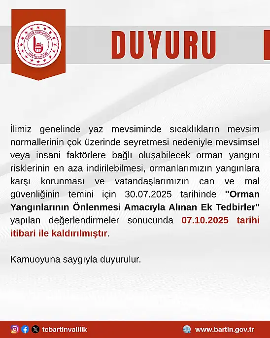 Bartın Valiliği, yaz aylarında artan sıcaklıkların mevsim normallerinin üzerinde seyretmesi nedeniyle alınan orman yangınlarına yönelik ek tedbirlerin kaldırıldığını duyurdu.